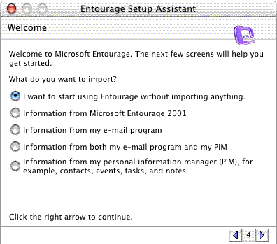 Step 1) If you have never used Entourage as your email program when you open the program and choose the Accounts option from the Tools menu you will see the Entourage Setup Assistant dialog. The first three screens pertain to personal information. We will begin the email setup on screen #4. Click to select the top choice in screen 4 then click on the right arrow key to advance to the next screen.
