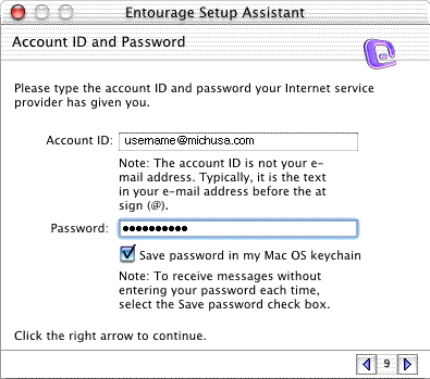 Step 6) Type your email address in the Account ID: field (make sure that the name is spelled correctly because the michusa.com mail server is case sensitive). Enter your password in the second field and check the box next to Save password... Click on the right arrow to move to the next screen.