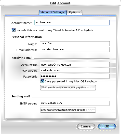 To edit your account or for those of you have an existing account or want to make another account simply choose the Accounts option from the Tools menu. Click on the New button. Click on the OK button. At this point you will see the setup assistant window. You can follow steps 1-7 or you can choose to configure your account manually. If you click on the Configure Your Account Manually button a dialog will appear similar to the one shown below. At this point you can follow the receipe below adding another name to the Account name: (replacing michusa.com with Jane Doe of something to distinguish it from the list of account names). The Options tab contains features that might be added to your account. Please refer to the Entourage help menu before using any of these features or call us at 248-478-4301. Click the OK button to start using your new account.