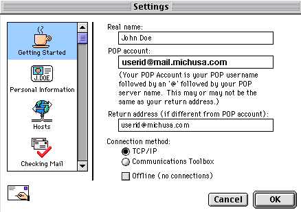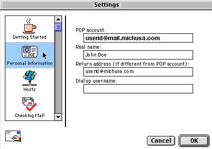 Step 2) Type your name in the Real name: field. The POP Account is the important part here. If you have your own domain, you will use username@yourdomain.com If you subscribe to michusa.com, use uerid@mail.michusa.com as your POP account: name. .For Return Address type in your E-Mail Address. Make sure that the TPC/IP radio button is selected, then click on the Personal Information icon in the left-hand window.