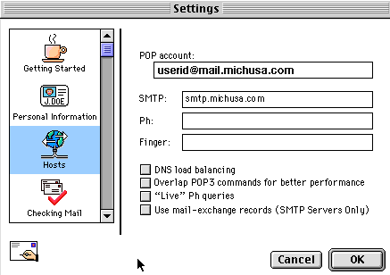 Step 3) The information from getting started should already apppear for the POP Account:, the Real name:, and the Return address fields. The Dial-Up Username: field does need to be filled in. It is the first part of your E-Mail Address. Click on the Hosts option in the left-hand window