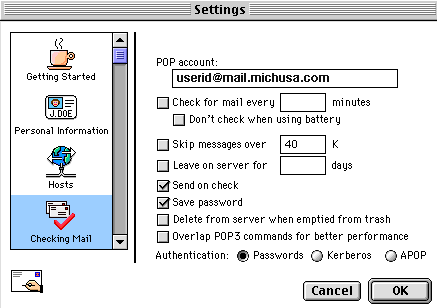 Step 4) Type smtp.michusa.com in the SMTP: field. Leave the Ph: and Finger: fields blank. All check boxes below the Finger: field should remain unchecked. Now, click on the Checking Mail option in the left-hand window.