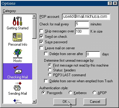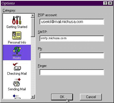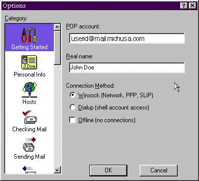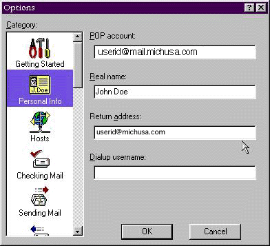 If you subscribe to michusa.com, use uerid@mail.michusa.com as your POP account: name. Type your name in the Real name: field. Your connection method should be set to Winsock (Network, PPP, SLIP. Next click on the Personal Info tab: