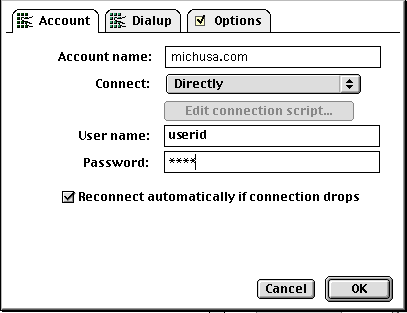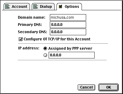 Type michusa.com in the Domain name: text box If you are using TCP/IP, check the box next to Configure OT TCP/IP for this Account. If you are not using TCP/IP, type the Primary DNS number for MICHUSA.COM:66.103.244.4and the Secondary DNS number: 66.103.244.5. If you have a dial-up account, select the radio button next to Assigned by PPP server for the IP Address:. If you have a dedicated line, select the second option for IP Address: and type in your IP address in the text box provided. Click the OK button.