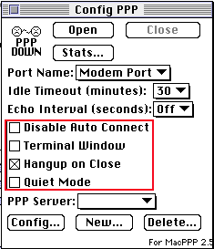 Choose ConfigPPP from the Control Panels option located under the Apple menu on the Desktop and follow the settings outlined in the diagram below: