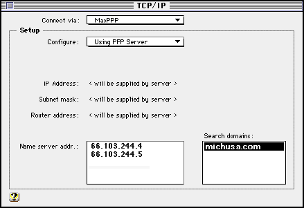 Locate the folder called "macppp25Folder " in your MICHUSA folder that appears on your desktop. Our software download section also contains these programs. Call our office at 248-478-4301 for the exact location of these files. Remove the two application icons (ConfigPPP and PPP ) from the folder and put them on the desktop. Make sure the System folder is visable and drop both of these icons (ConfigPPP and PPP ) on the System folder. A dialog box will be displayed for both icons, informing you where they should belong in the System folder. Click OK to accept the placement of both icons in the System folder.