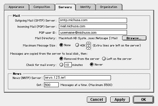 Step 2) Click on the Servers tab and type the following information: smtp.michusa.com in the Outgoing Mail (SMTP) Server: field and mail.michusa.com in the Incoming Mail (POP) Server: field. Type your michusa.com user name being careful to type it exactly (the user name is case sensitive). Leave the Maximum Message Size set to None. The radio button should also be set to have your messages removed from the server unless you get a message at your home computer, but want to get it at work, you will be able to because it is still on the server. The down side is that this will tend to fill up your E-Mail space on your michusa.com server. You also have the option to check mail at various intervals. For the news server type news.123.net. and leave the default of 500 messages in the field for the Get: option. Click on the Identity tab to continue the setup.