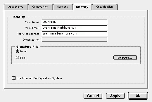 Step 3) Type your michusa.com login or username in the Your Name: field. Type your michusa.com email address in the Your Email: and Reply-to-address: fields. If you have a signature file (something that you would like to include at the end of each email) you may add it at this time by chosing the Browse... button and retrieving the signature from your computer. If you do not have a signature leave the selection at the default (None).