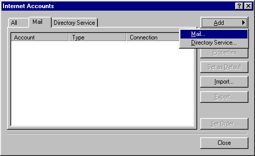Step 1) From MS Outlook2000, click on Tools menu, and select Accounts option. Then click on Mail tab, then select the Add button and go to the Mail