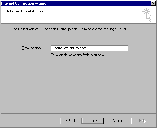 Step 3) Leave the incoming mail server name set to the POP3 selection. Type mail.michusa.com in the Incoming mail (POP3) or (IMAP) server field. Type smtp.michusa.com in the Outgoing mail (SMTP) server field.then click the Next button to continue the setup.