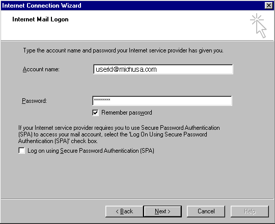Step 4) Type your account name in the field text box (your account name is your email address. Please make sure that it is correctly entered. The michusa.com mail server is case sensitive). Type your password in the bottom text box the click on the Next button to continue.