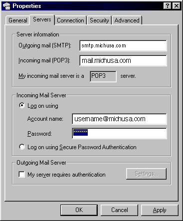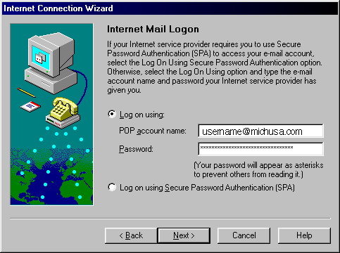 Step 4) In this window, Select the Log on Using: radio button then enter your username (username@michusa.com) and password. Click the Next button.
