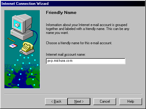 Step 5) You will be prompted to give a friendly name in this screen. Our default suggestion is to use pop.michusa. Click the Next button to continue the setup.