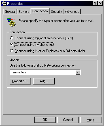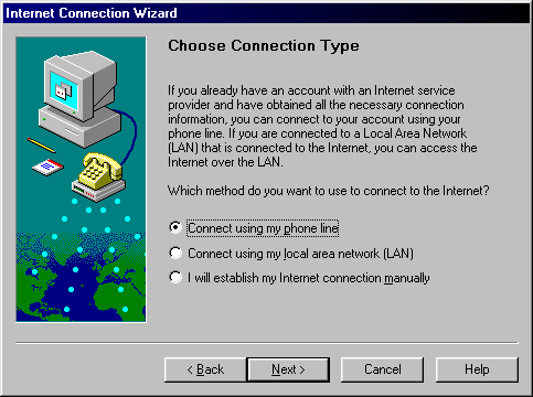 Step 6) In this screen, choose a connection type. For most applications use "Connect using my phone line" unless otherwise instructed. Click on the Next button.