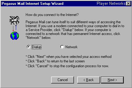 Step 6) Select the Dialup radio button if you have a dial-up connection with michusa.com. If you have a permanent connection, select the Network radio button. Click on the Next button to move forward to the next screen.