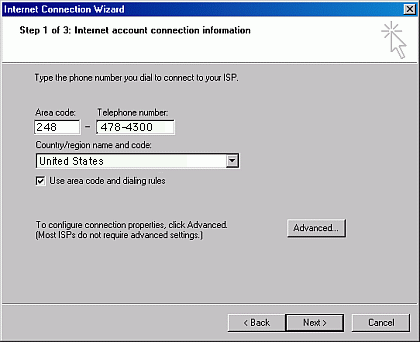Step 4) Type in the Area code and the local access michusa.com number. Select United States for the Country/region name and code. Make sure that the Use area code and dialing rules box is checked then click the Next button to continue.