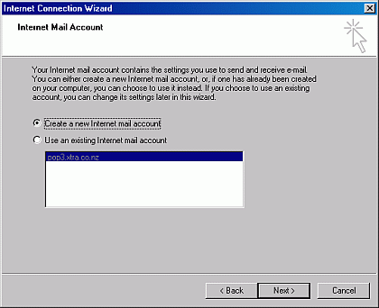 Step 8) If you do not have an internet mail account select the Create a new Internet mail account option. If you already have an internet mail account you can select the bottom option and point to where the account is on your computer. Click the Next button.