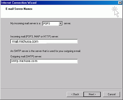 Step 11) Make sure the POP3 appears in the top field (My incoming mail server is a POP3 server). Type mail.michusa.com in the Incoming mail server field. Type smtp.michusa.com for the outgoing mail server name then click on the Next button.