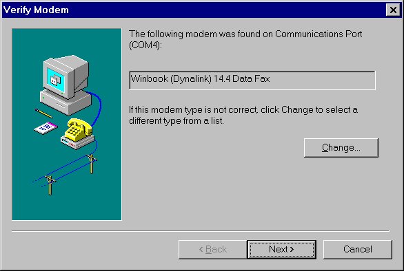 Windows 95 will now ask you to verify the type of modem that has been detected. If the correct modem type is shown, continue on the end of hardware installation. If the correct type is not shown, click Change to select a different modem from a list.