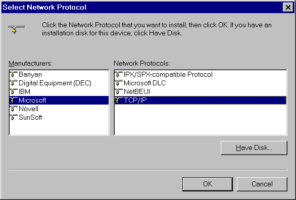 In the Select Network Protocol dialog box: Under Manufacturer, click on Microsoft (Left Side of Screen) Under Network Protocol, click on TCP/IP (Right Side of Screen).