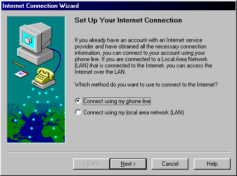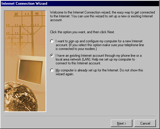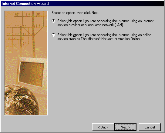 Step 1) Click on the top radio button using the option to connect to a ISP or local area network. Click on the Next button.