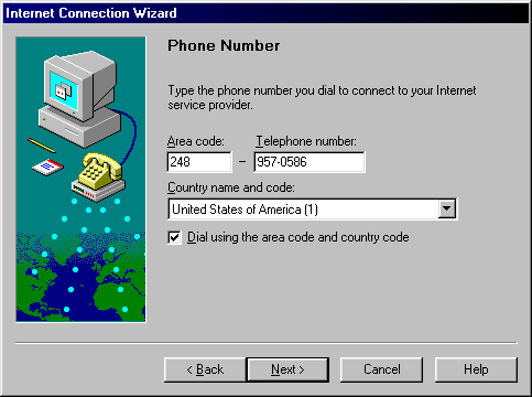 Step 4) Type your area code and your michusa access number in the appropriate fields. The country namd and code should be set at the default: United States of America (1). Also make sure the box is checked for Dial using the area code and country code. Click the Next button to continue.