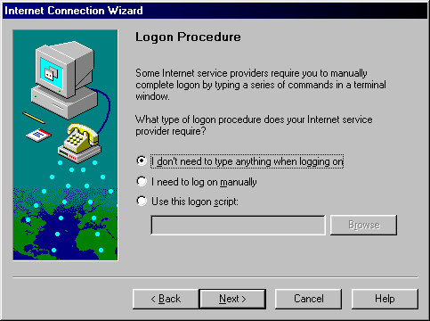 Step 8) You will NOT need to type anything when you log on therefore select the top setting. Click the Next button to continue.